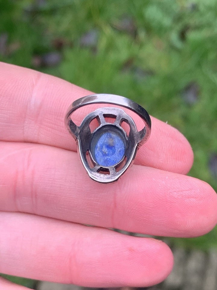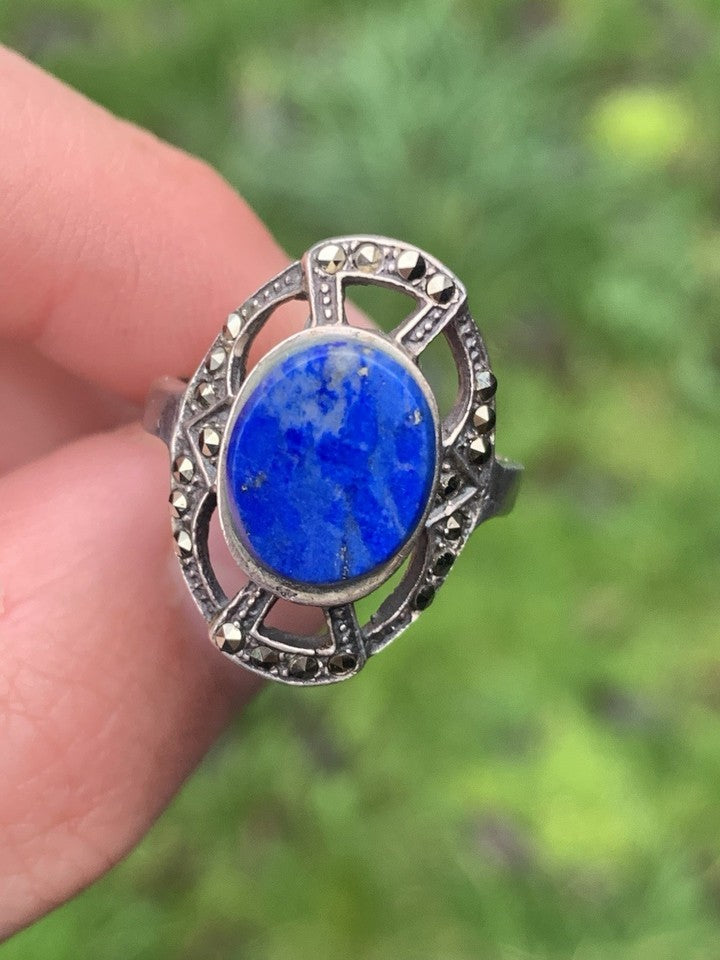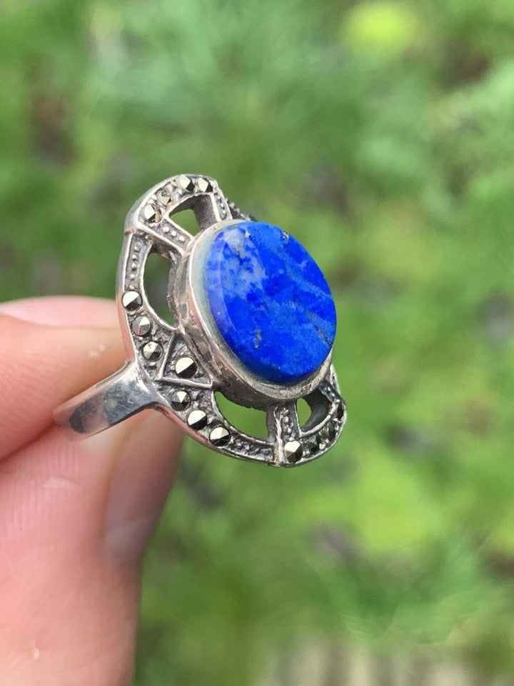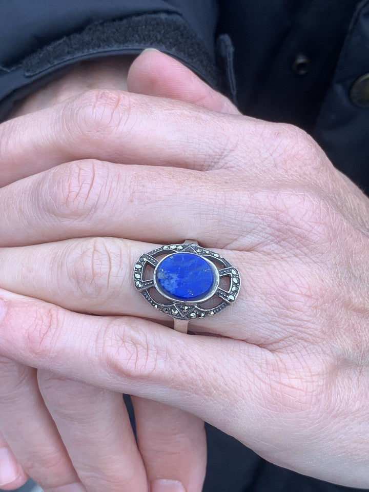 シルバー製ラピスラズリとマルカサイトをあしらったアールデコ調大型リングを販売いたします。