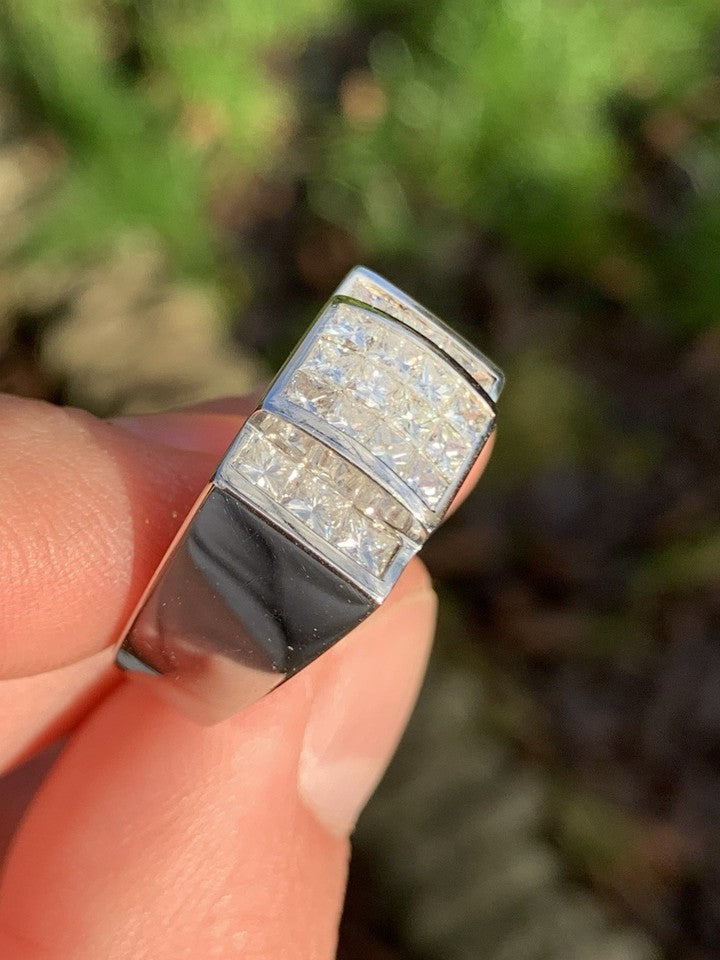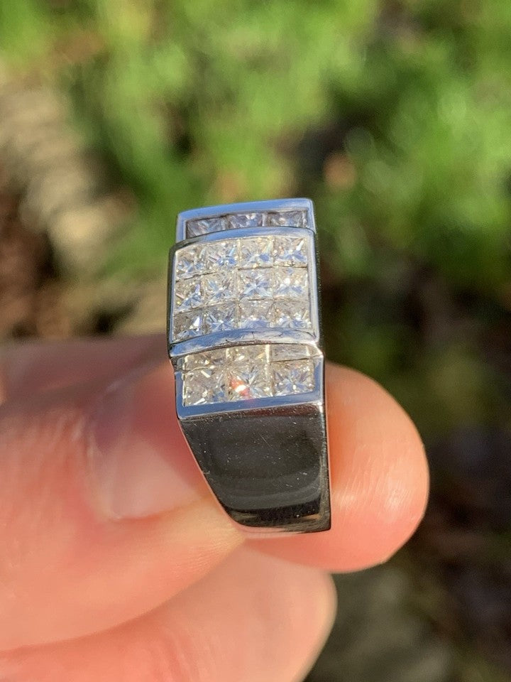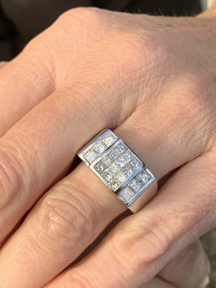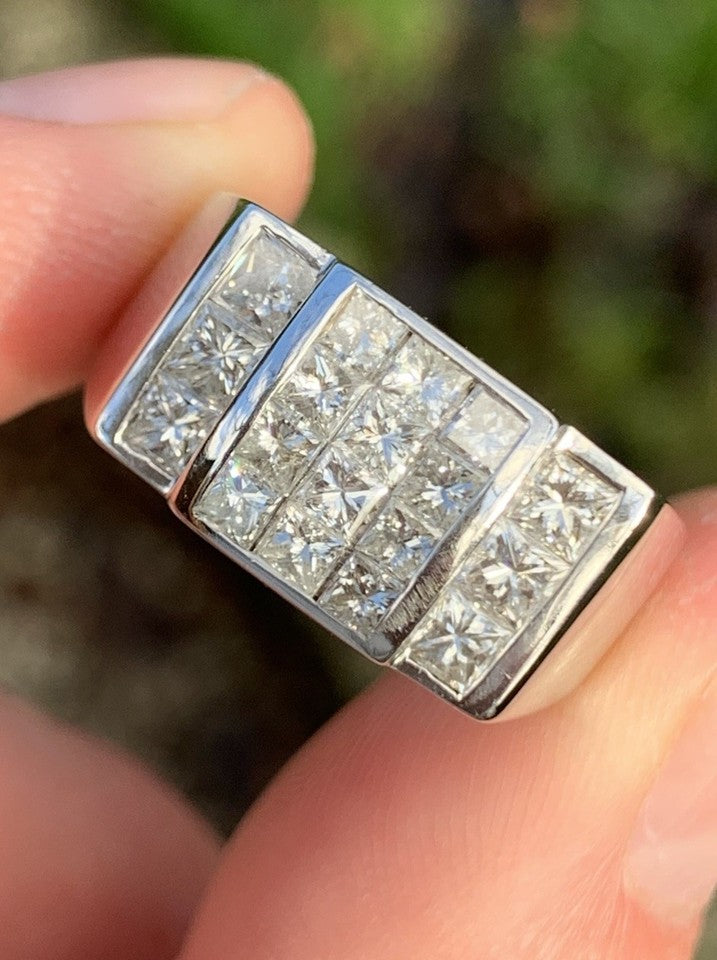 14金ホワイトゴールド製、1.80カラットプリンセスカットダイヤモンドを配した特大クラスターリングを販売いたします。