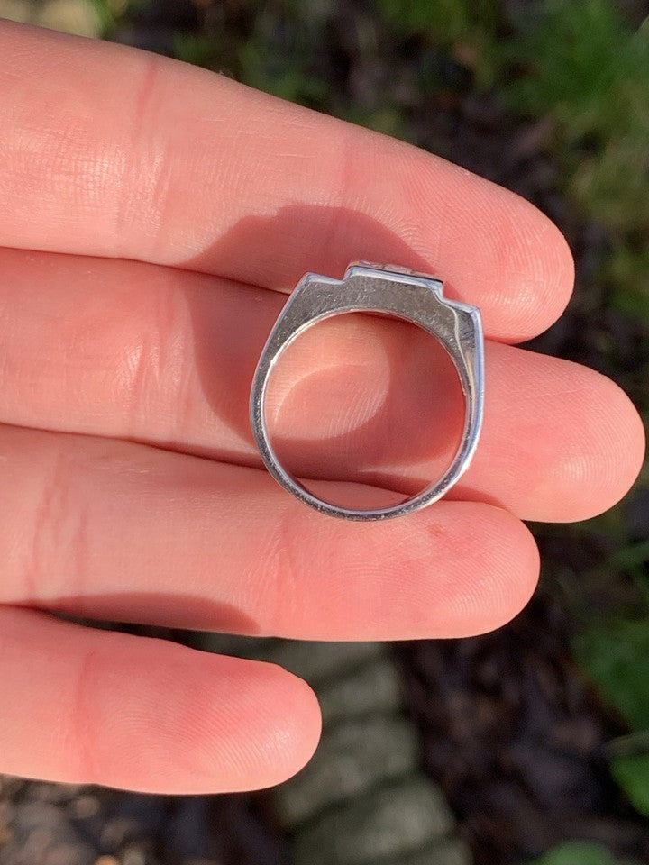 美しい大型クラスターリングで、純度14カラットのホワイトゴールド製(14K刻印あり)です。