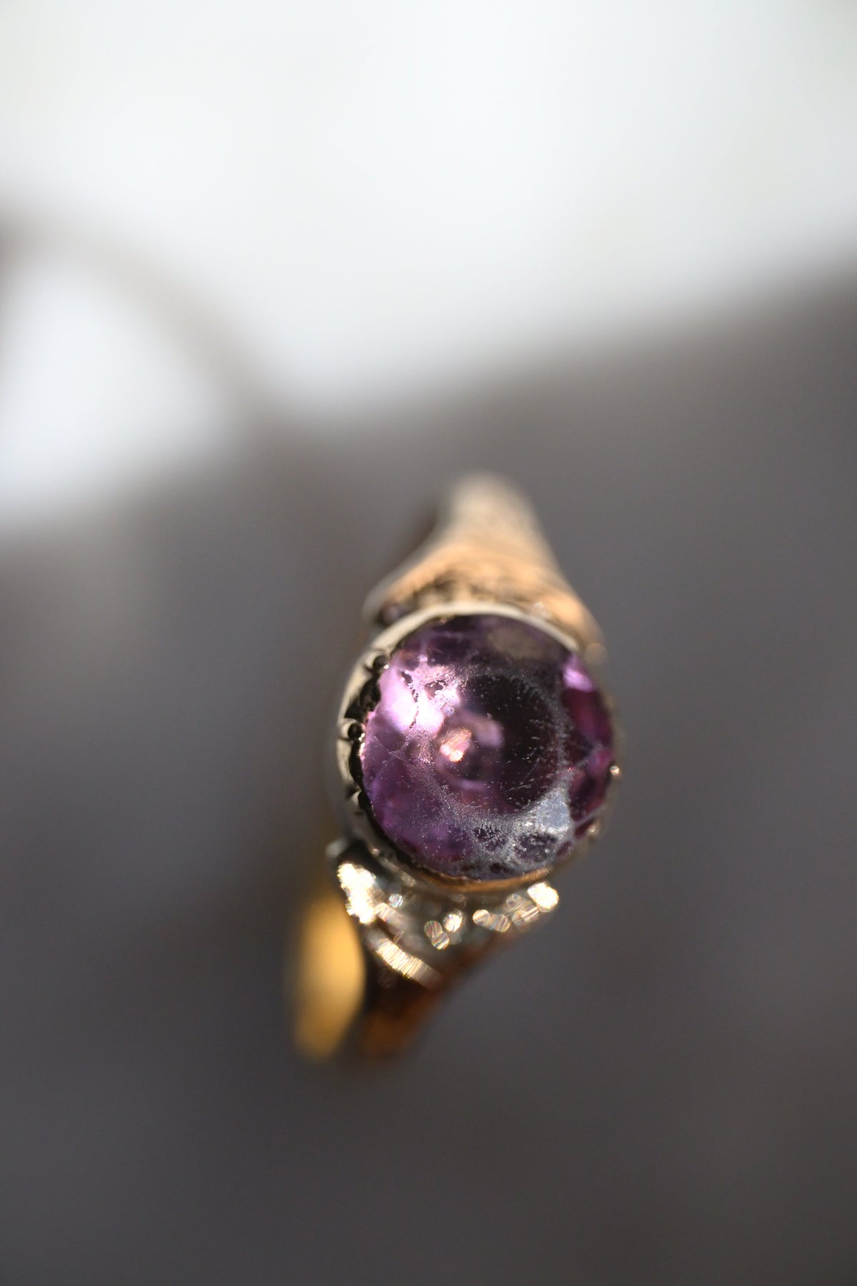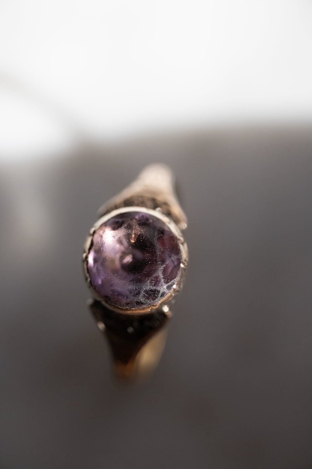 中央に鎮座するのは、吸い込まれるような深淵な紫を湛えた天然アメジスト。
