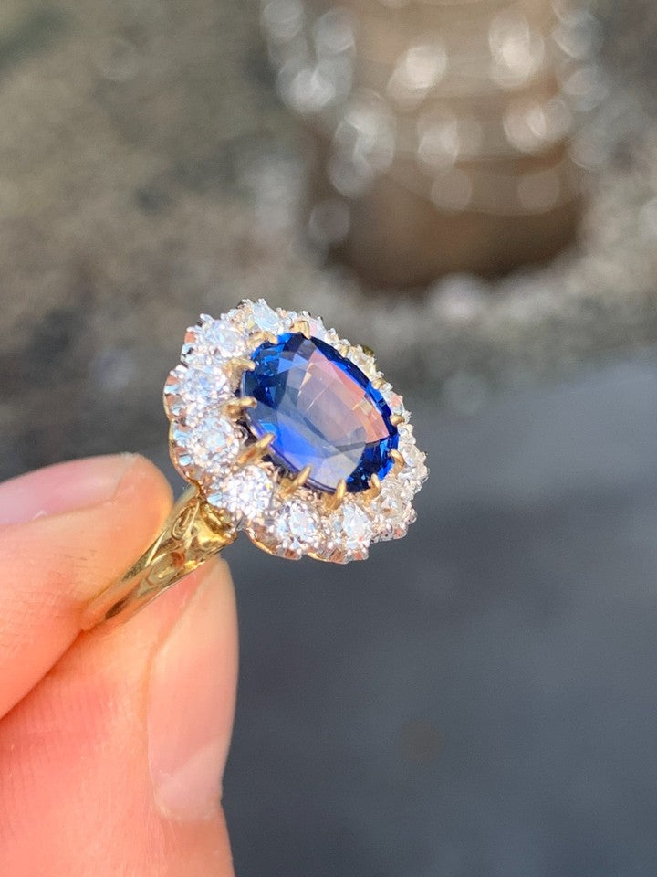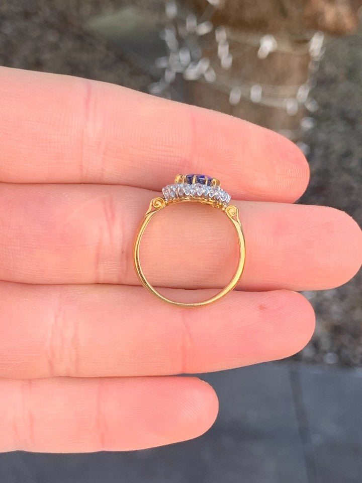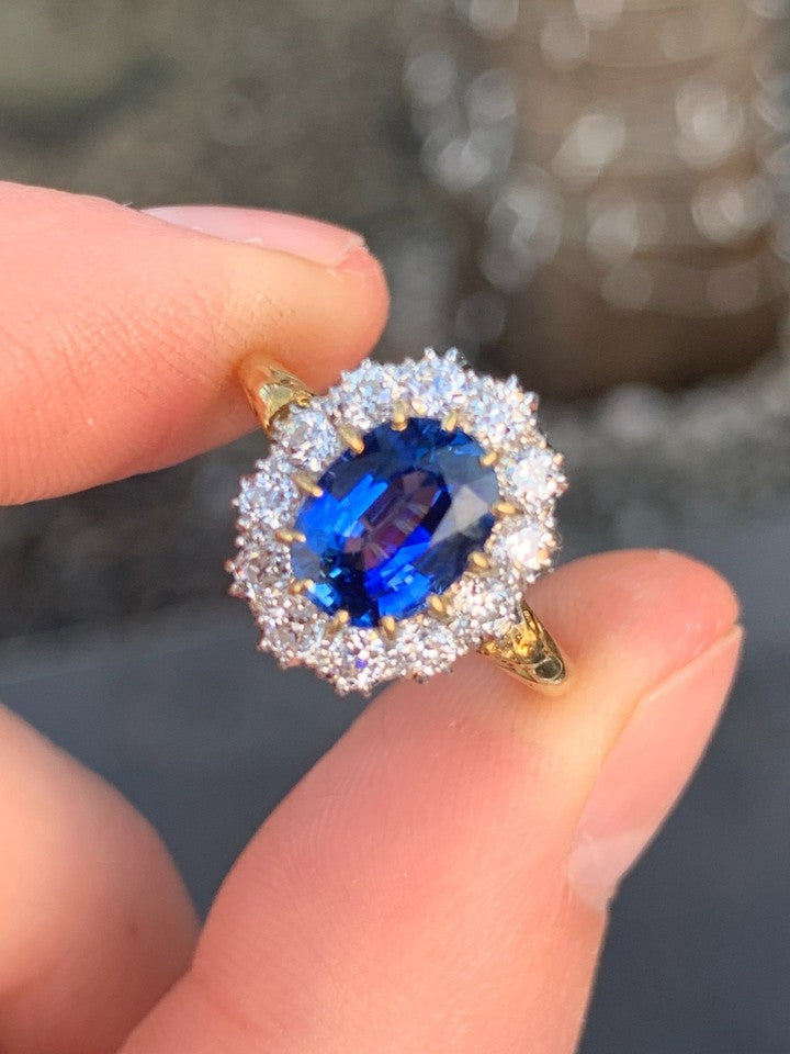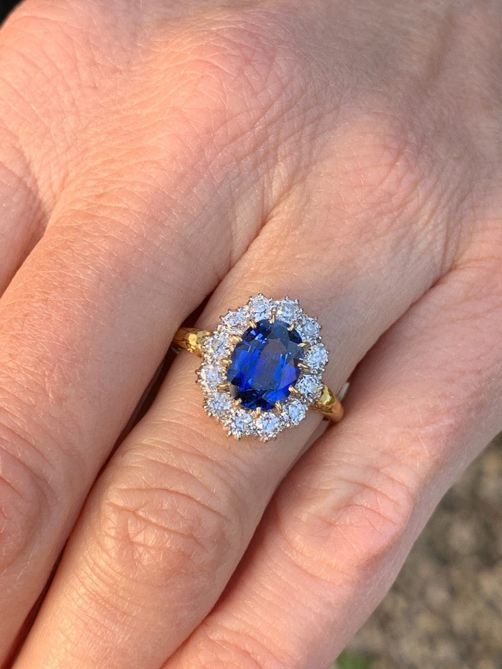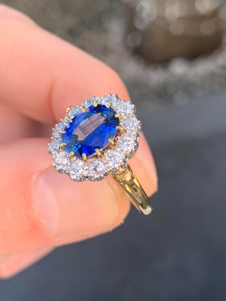 18金イエローゴールドとホワイトゴールドの刻印が入った、上質な18金ダイヤモンド天然サファイアクラスターリングを販売いたします。