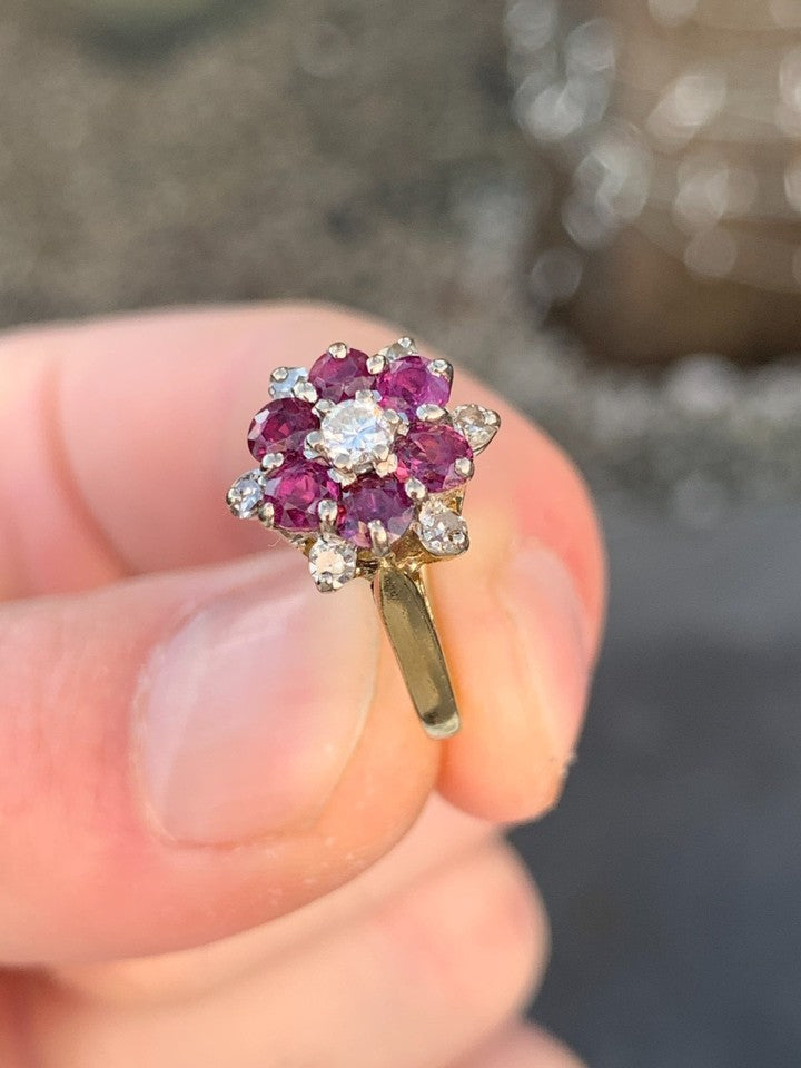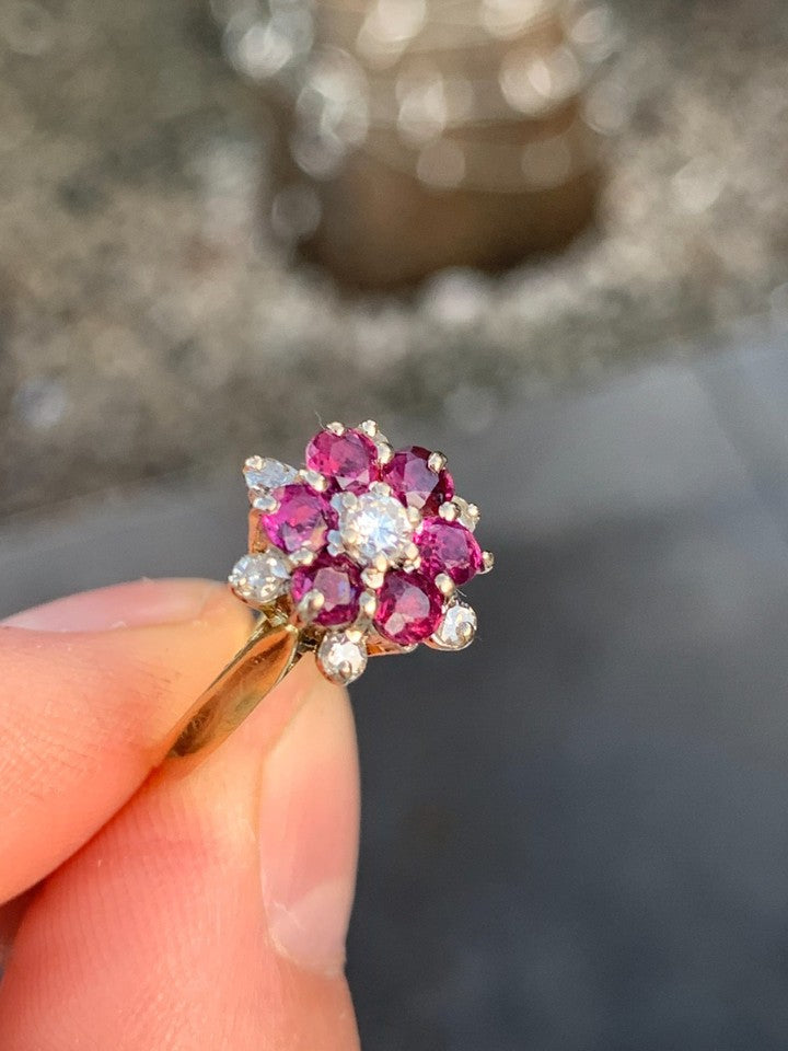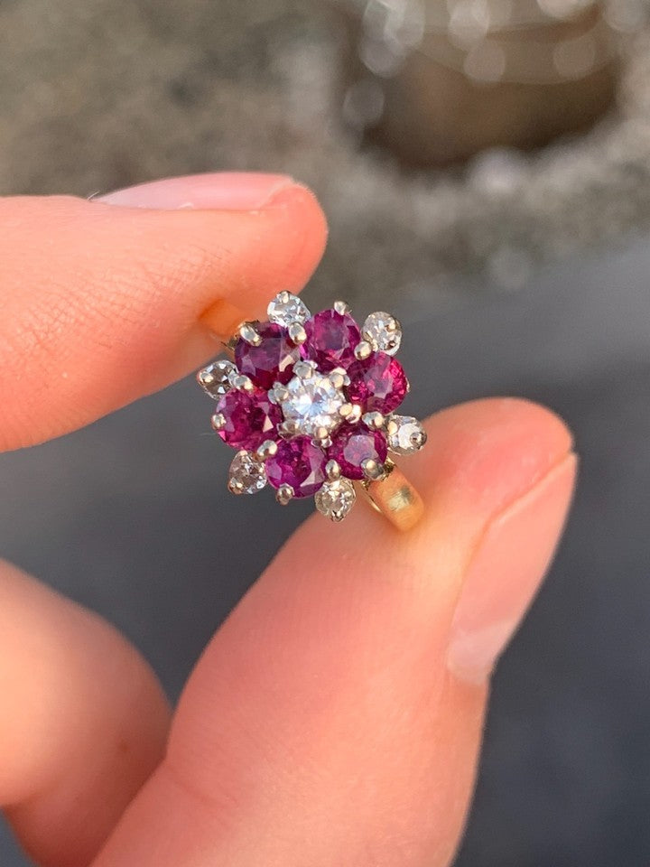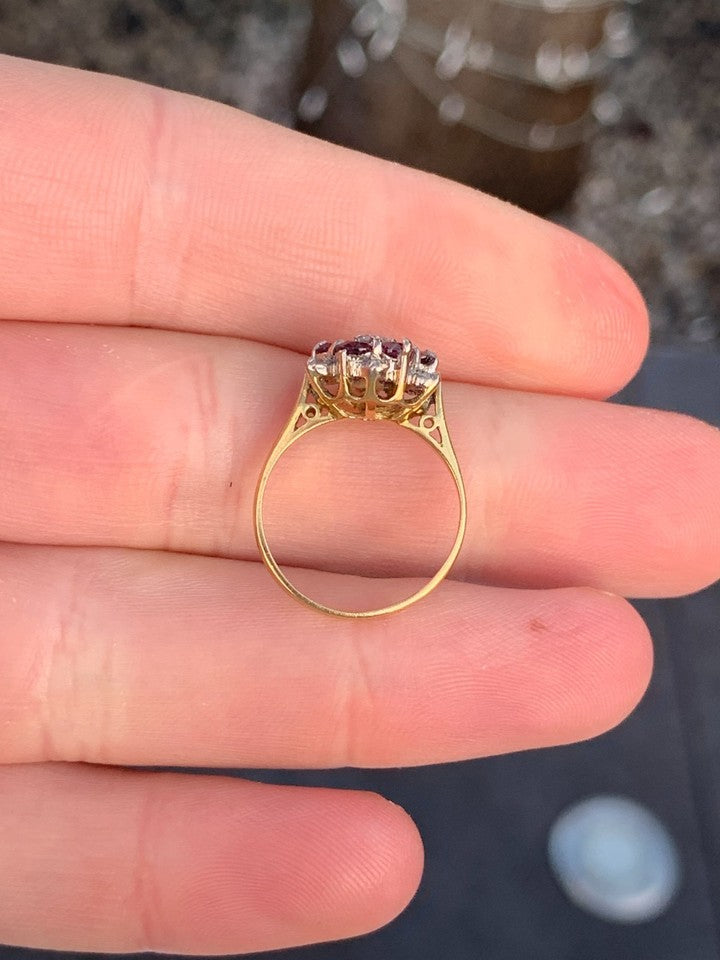 18金イエローゴールドとホワイトゴールドの刻印が入った、上質な18金ダイヤモンドルビークラスターリングを販売いたします。