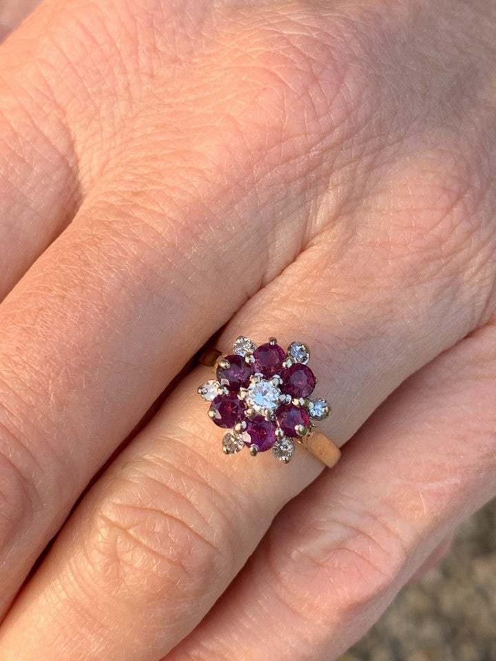 リングには約10ポイントの美しいルビーと、約10ポイントのダイヤモンド1石、さらに約2.5ポイントの輝くダイヤモンドがセットされています。