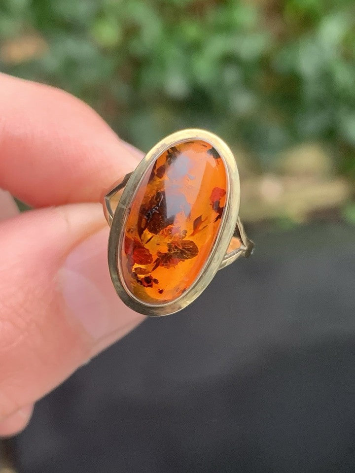 表面には美しい大型の黄金色の天然琥珀がセットされた、素敵なヴィンテージリングです。