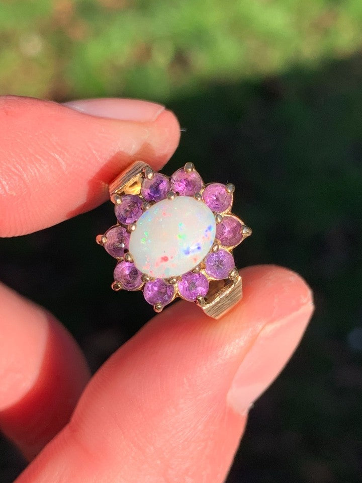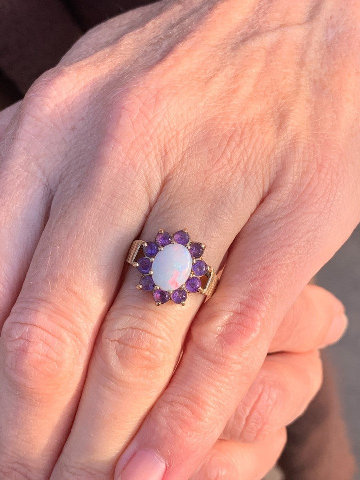 リングにはピンク、グリーン、ブルーの輝きを放つ美しい天然オパールと、約10ポイントのアメジストがセットされています。
