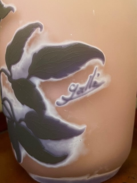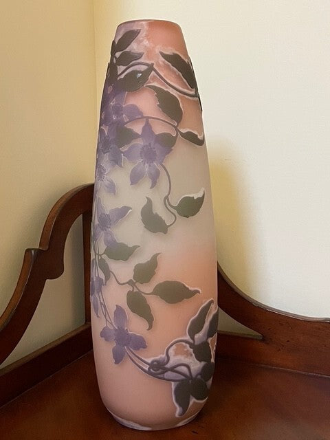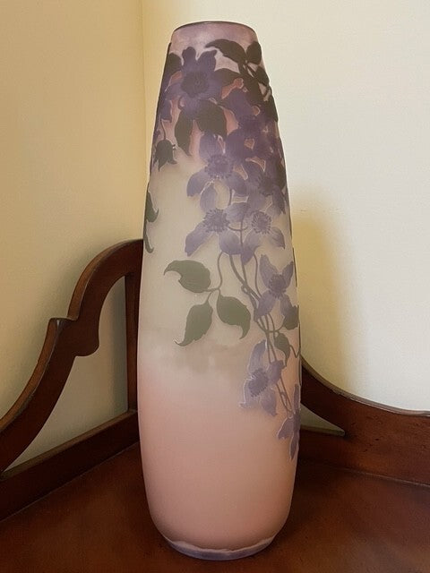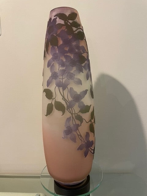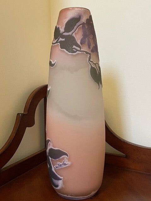 エミール・ガレによる見事な大型の初期(20世紀初頭頃)作品、ピンク、紫、緑の藤の花をモチーフにしたカメオ技法のガラス製アール・ヌーヴォー花瓶です。