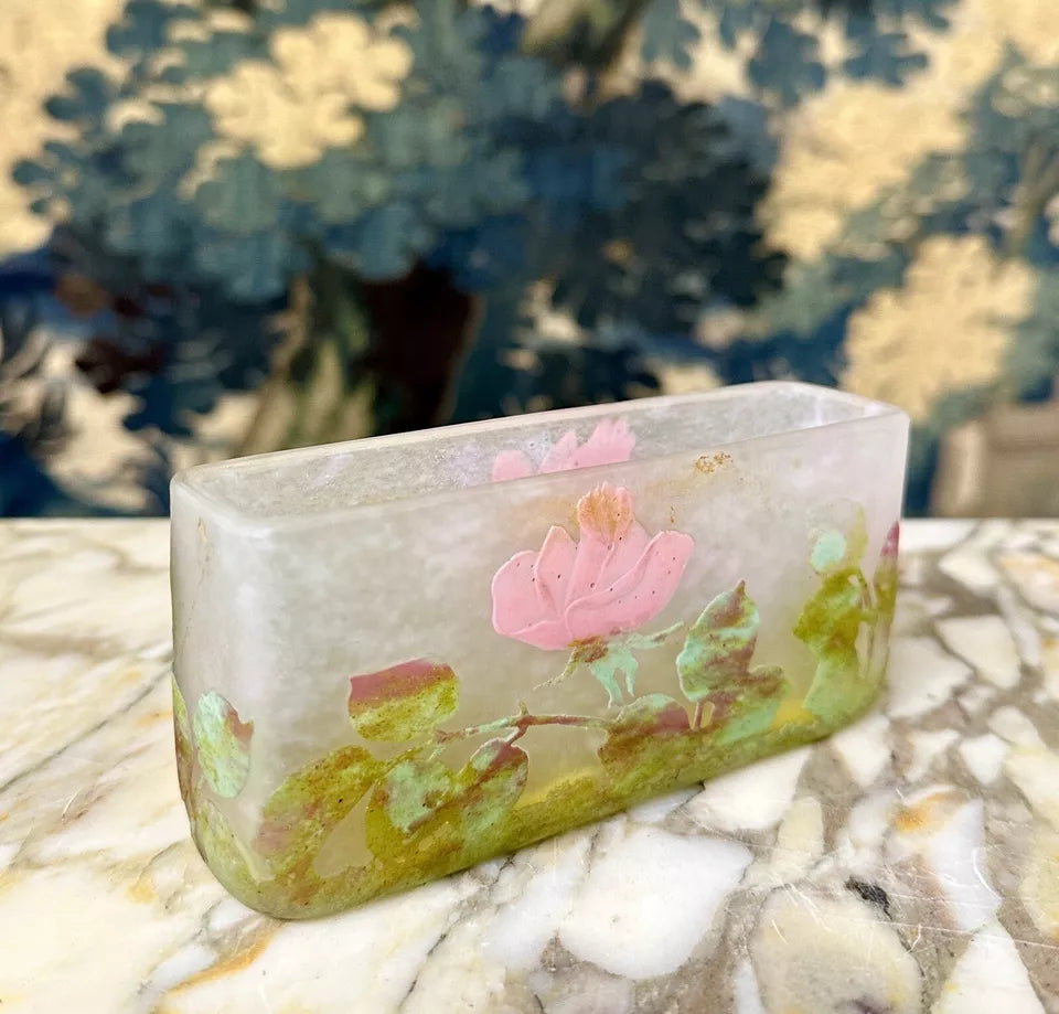 この立体的に見える、偽物の花瓶なのですが『アプリカシオン』という技法をを使っており、本物の様に見えますがガラスの色味に深みが無く葉っぱも花も雑に作られています。