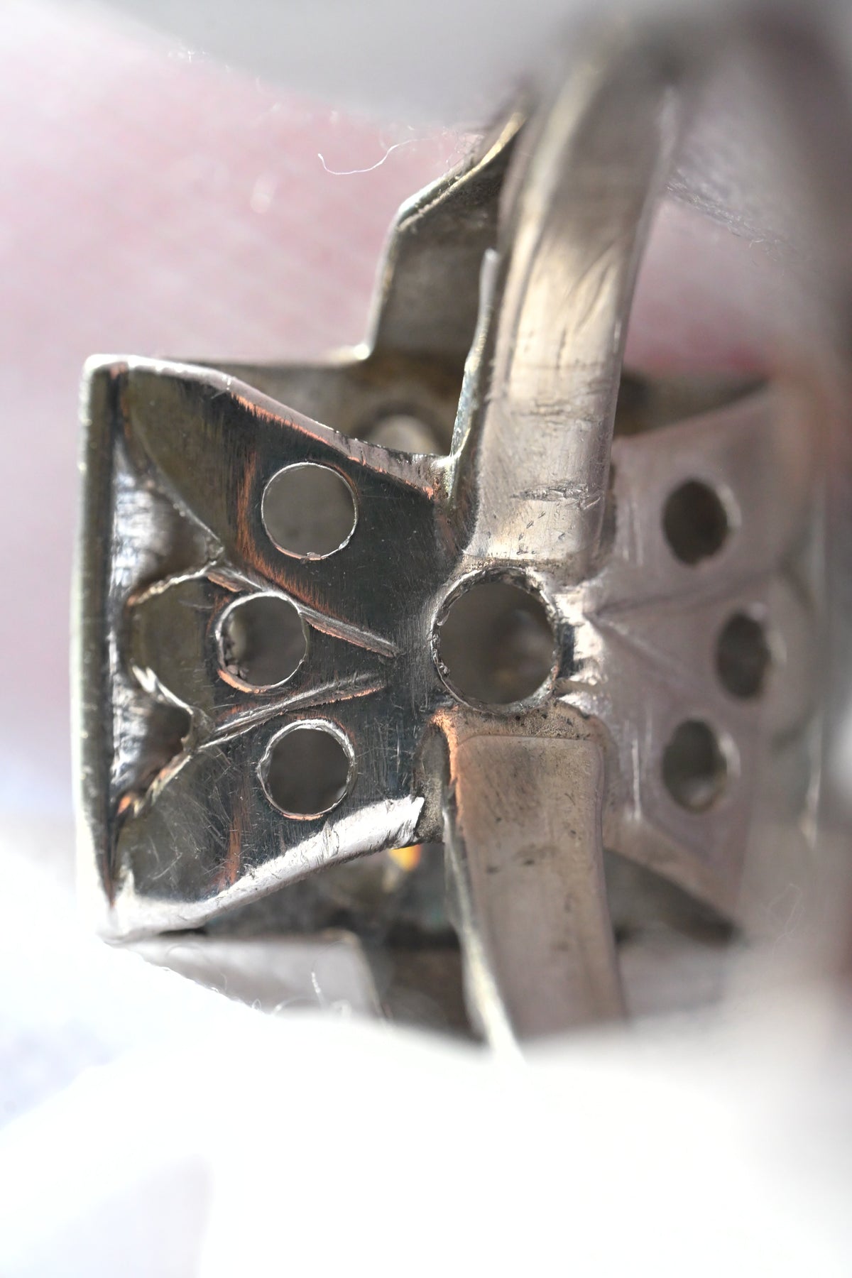 当時、金よりも遥かに稀少で加工が困難だったプラチナを贅沢に使用し、現代のジュエリーにはない繊細な幾何学模様を描き出しています。