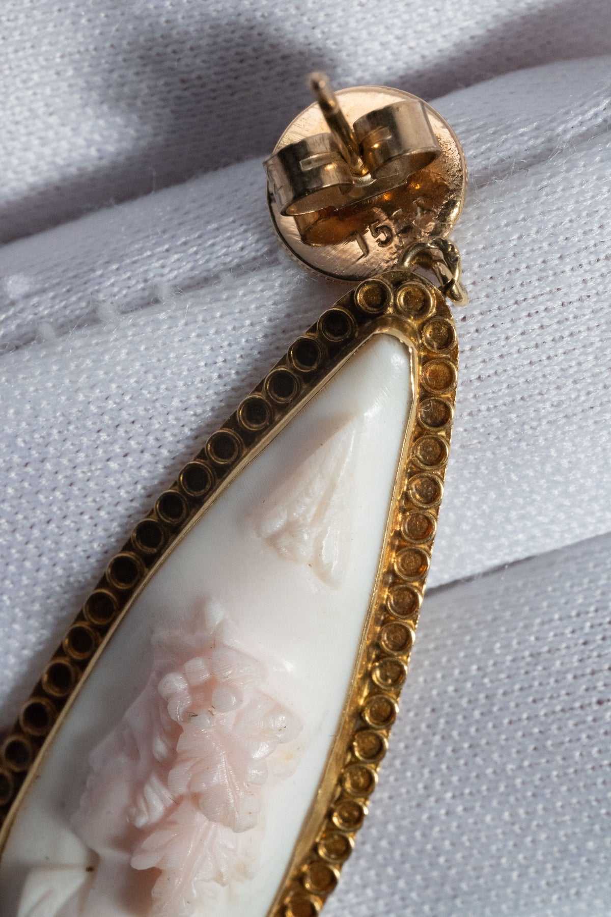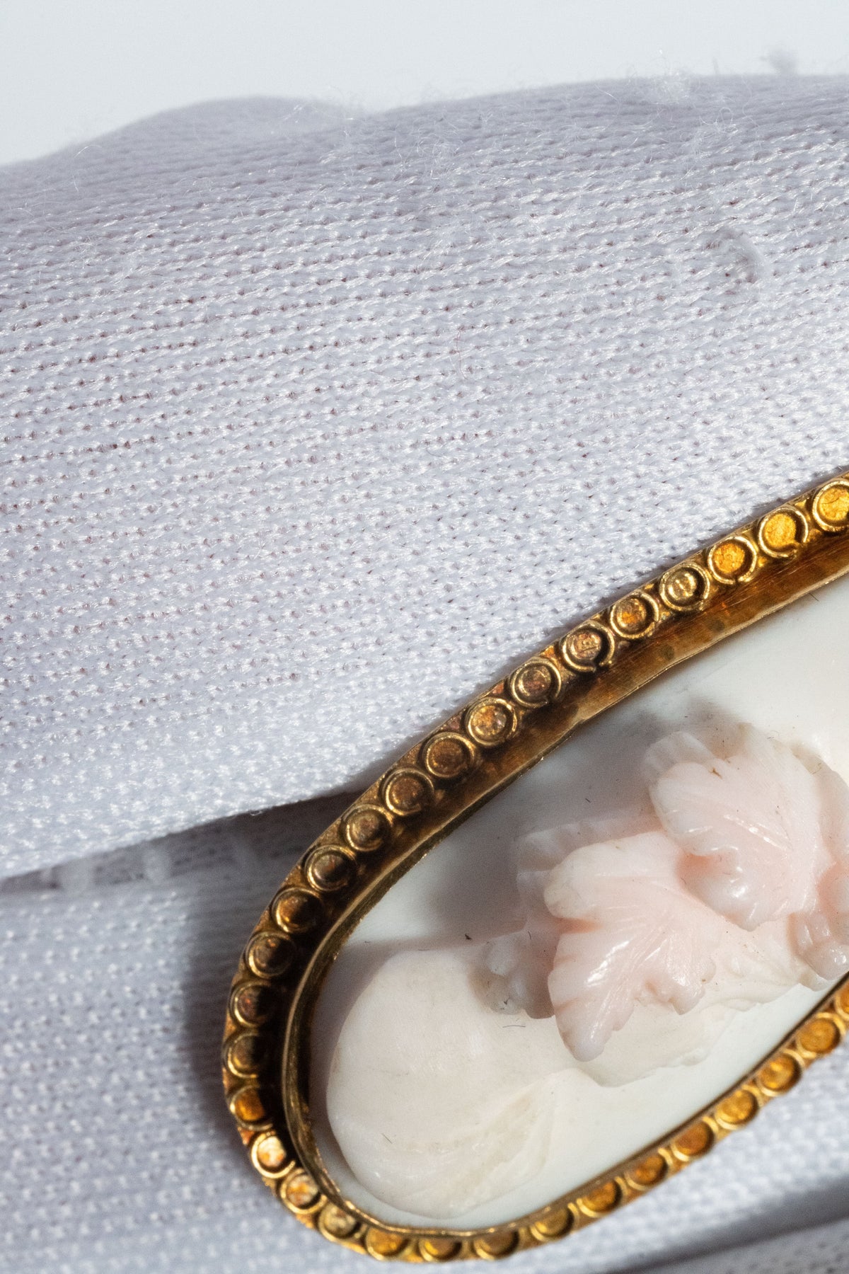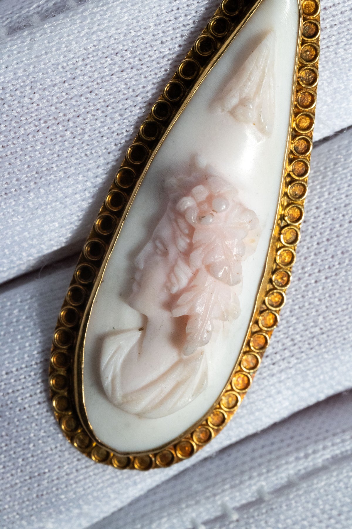 カメオの周囲を縁取るのは、エトルスカン様式最大の特徴である「グラニュレーション(粒金細工)」を彷彿とさせる、細密なゴールドワークです。