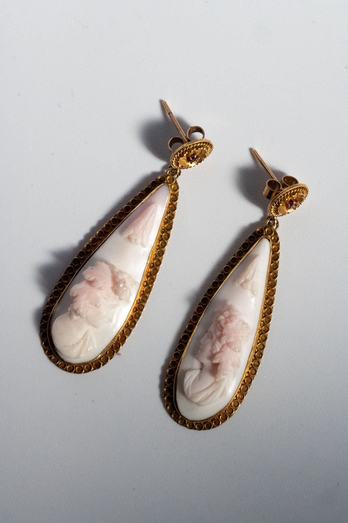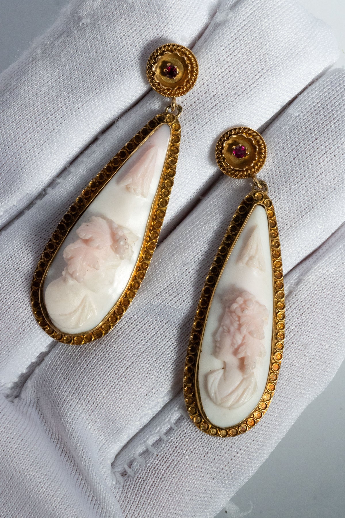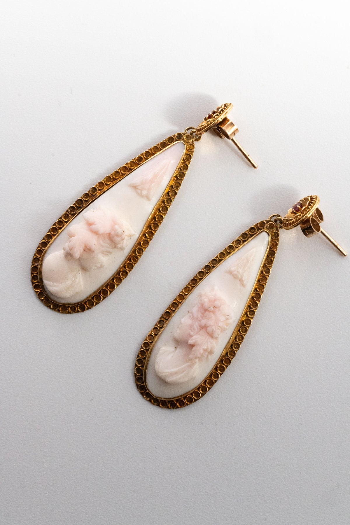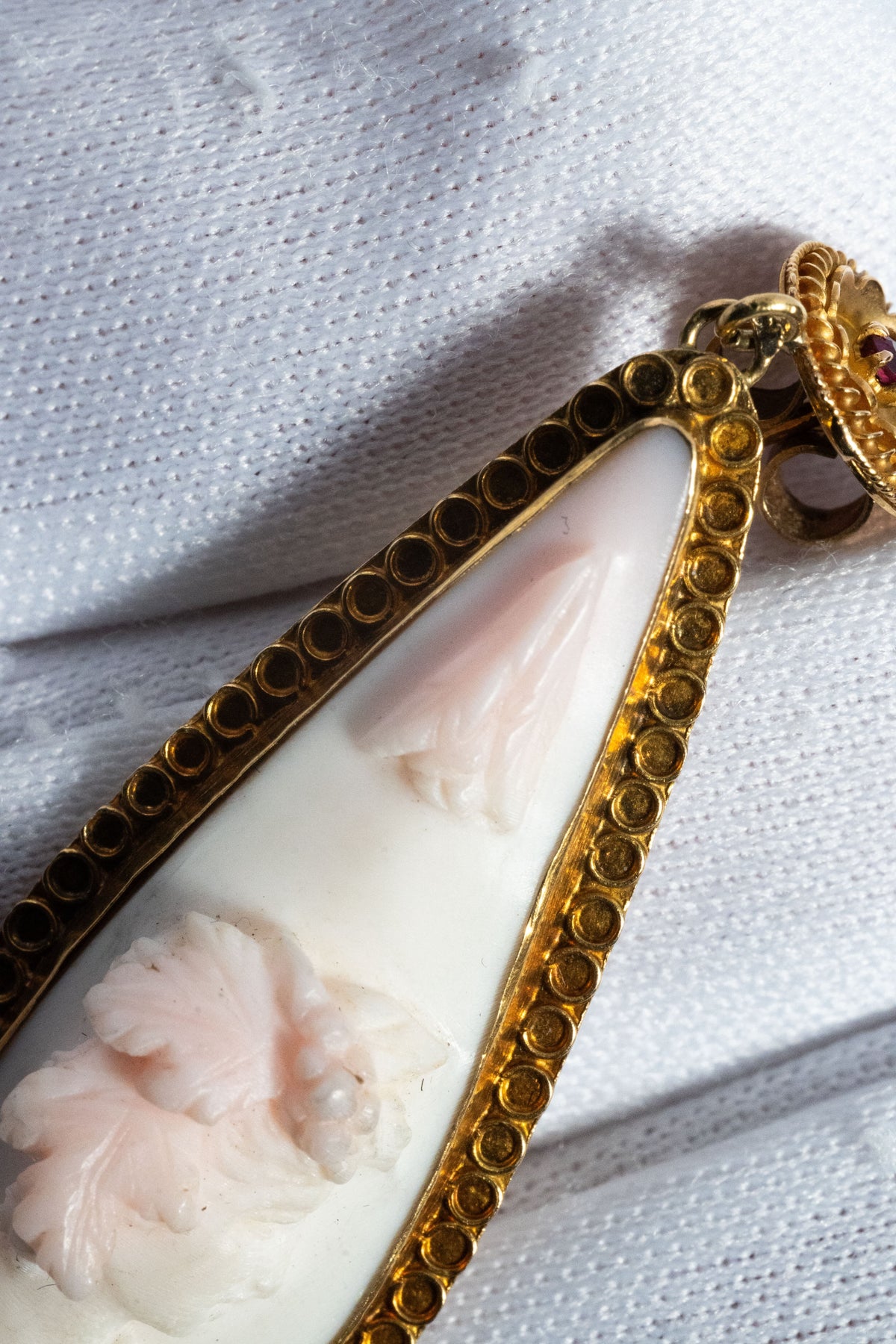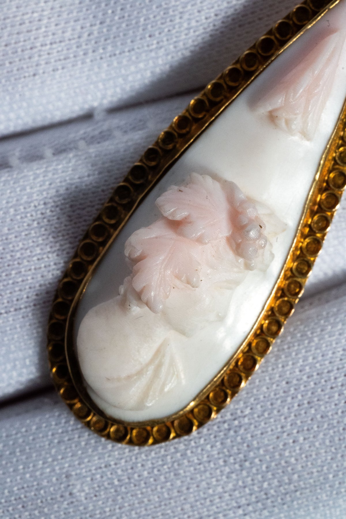 主役は、淡い色彩の珊瑚(コーラル)に一彫りずつ丁寧に刻まれたカメオ。