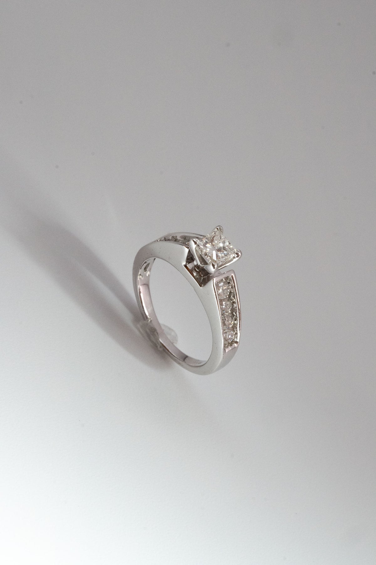 主役は、中央に鎮座する約0.70カラットの「プリンセスカット・ダイヤモンド」。