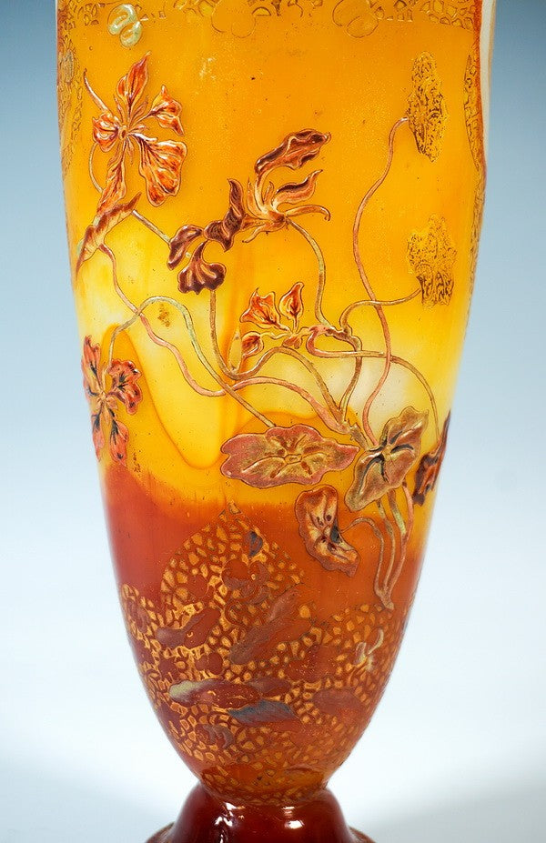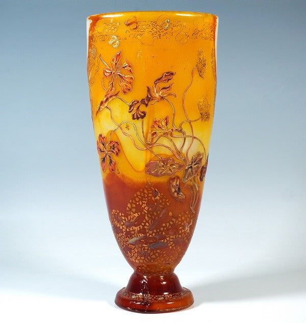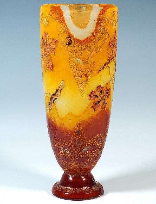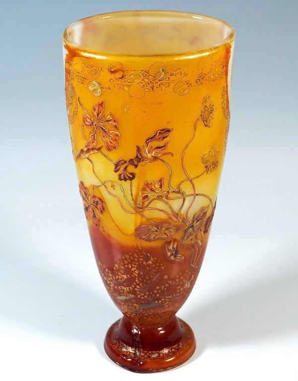 無色の厚肉ガラスに乳白色のオパライジング、黄色とカーネーション色のサブオーバーレイを施し、 上部縁部には様式化された装飾と花文様を組み合わせたエッチング装飾と彩色不透明エナメル絵付けを施しています。