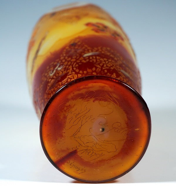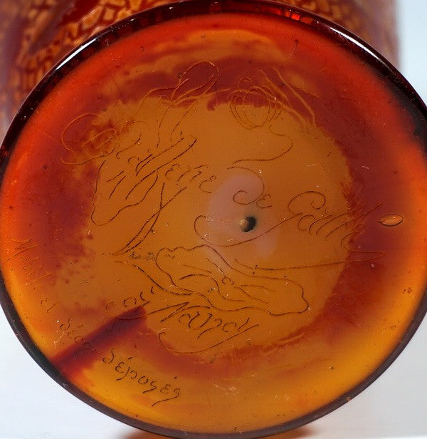 底面に針彫り花紋の署名「クリスタリー・ド・ガレ、ナンシー製/モデル及び装飾登録済み」があります。