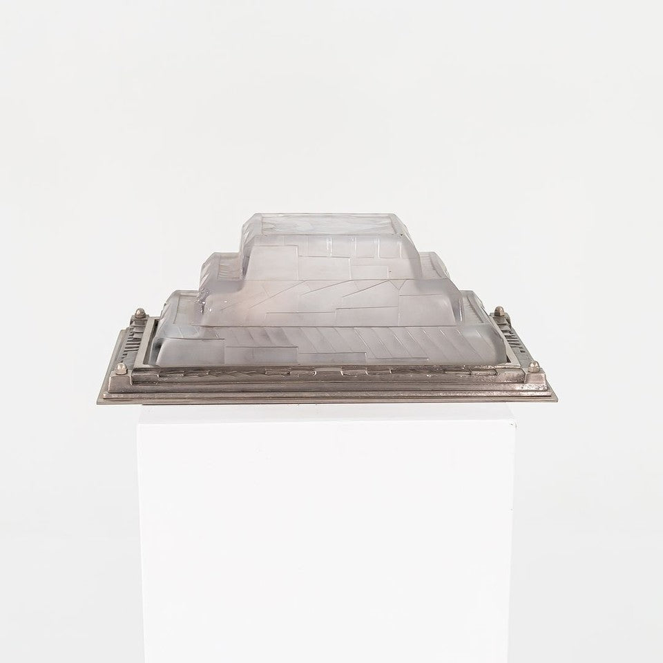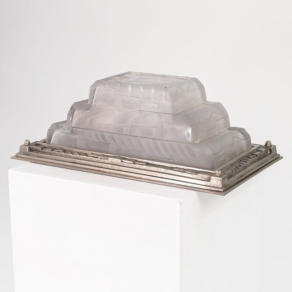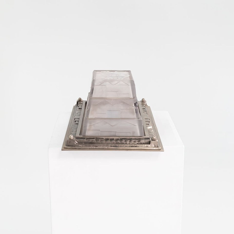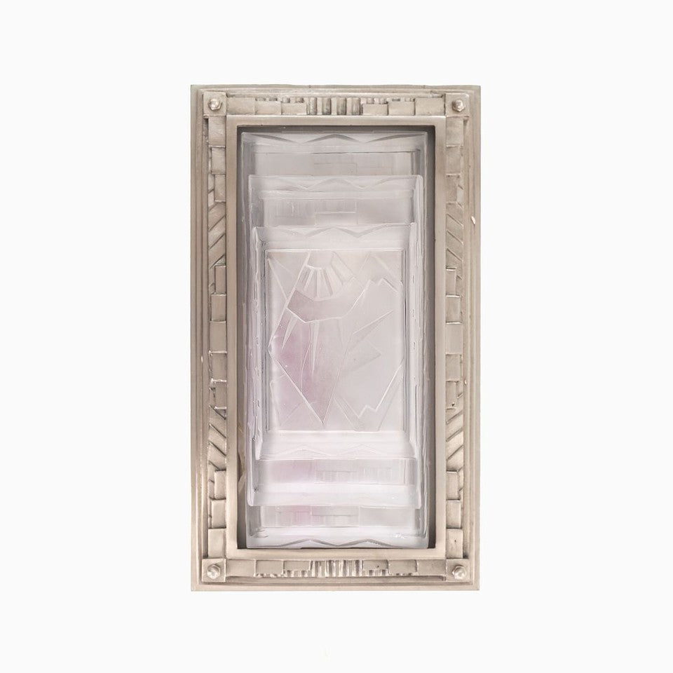 デザインは、精巧な幾何学的なエンパイア様式のモチーフが施された成形の透明なフロストガラスシェードが特徴で、ニッケルメッキのブロンズ製フレームに取付けられています。