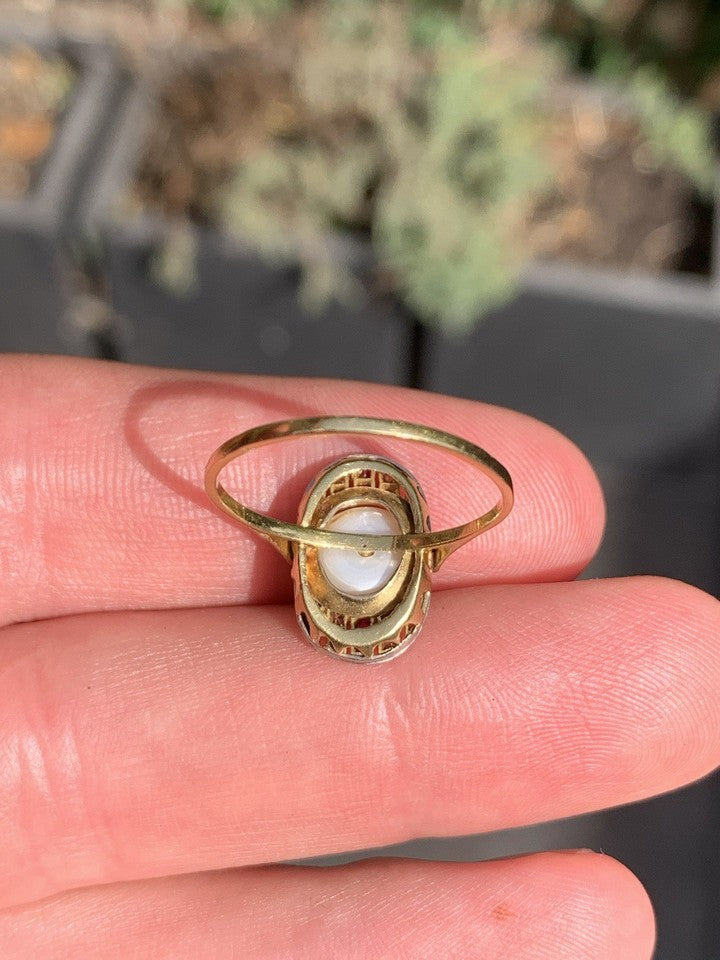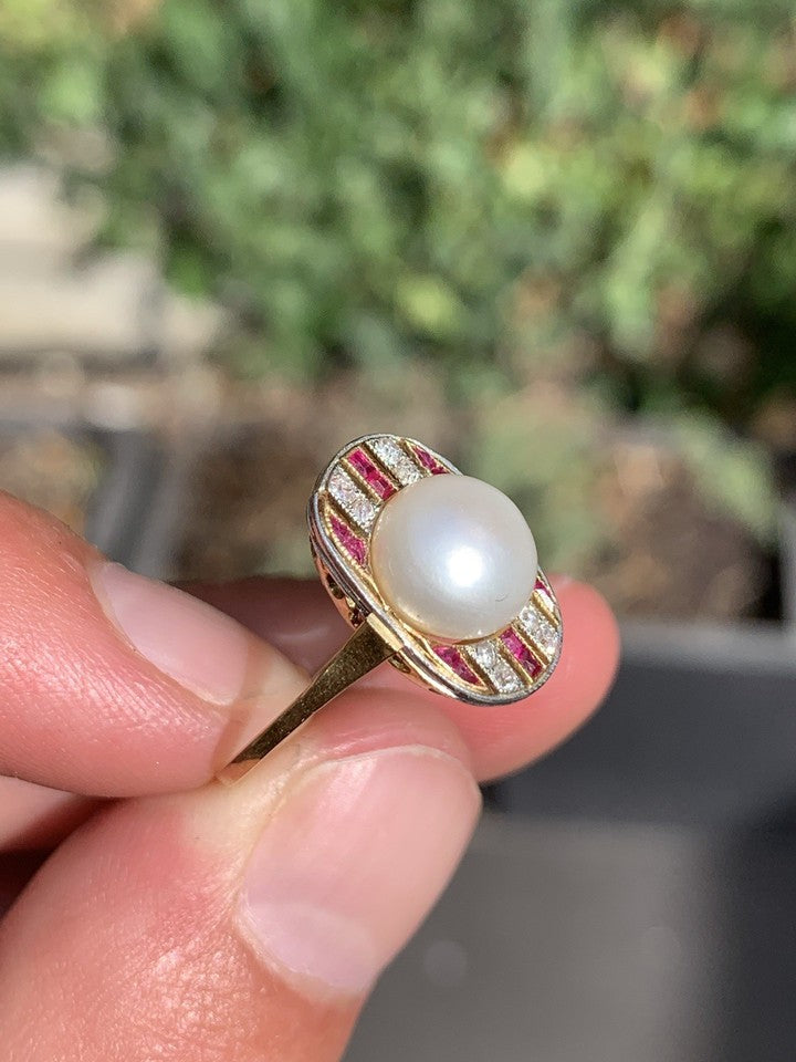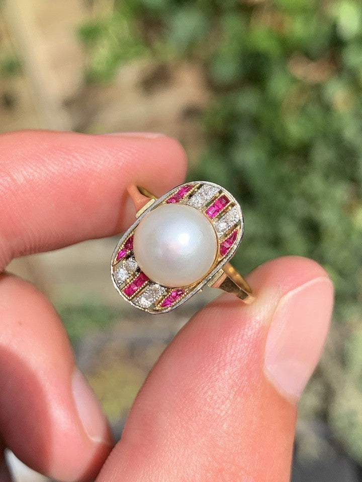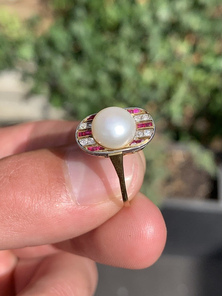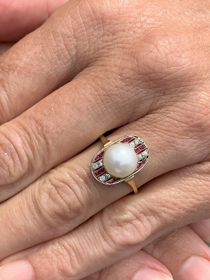 18ct ゴールド アールデコ プリンセス カット ルビー ダイヤモンド パール リング 3.2 グラム