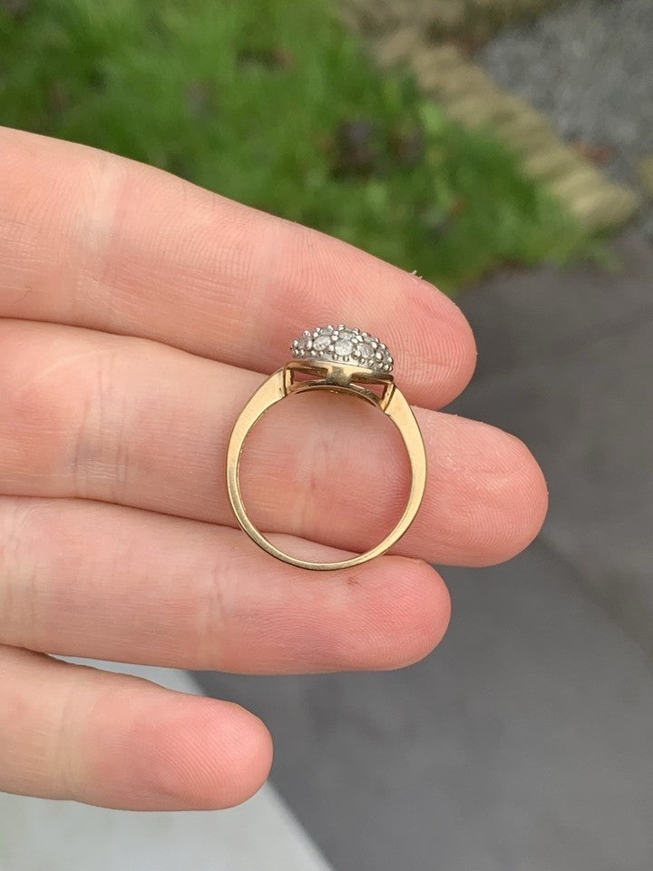 9金刻印入りの、美しい輝きを放つダイヤモンド(リング全体で約1カラット)をあしらった優雅なパールドロップクラスターリングです。