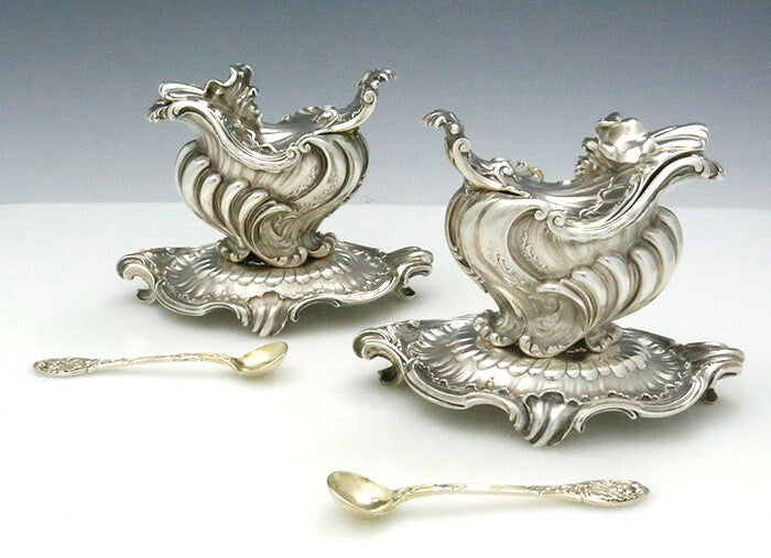 精巧な装飾を施したフランス製アンティーク950シルバー(925スターリングシルバーより純度が高い)の蓋付き調味料ポット一対です。